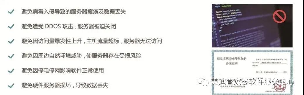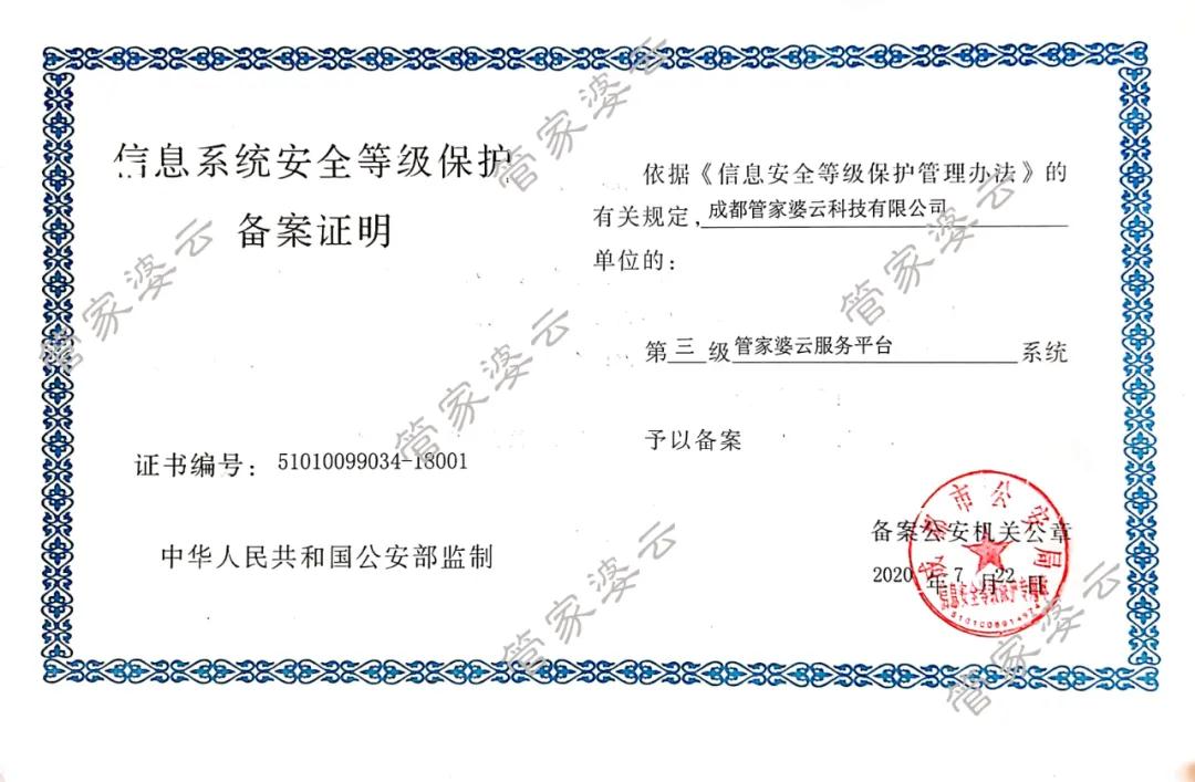 数据是企业最重要的资产,数据安全的重要性不言而喻。管家婆云依托全球顶级IAAS厂商,建立了ISO27001国际信息安全标准认证安全防护技术,并成功获得“信息系统安全等级保护”三级认证(国家信息安全方面,对非银行金融机构的最高级认证),让您的数据永久安全可靠,软件系统运行稳定。